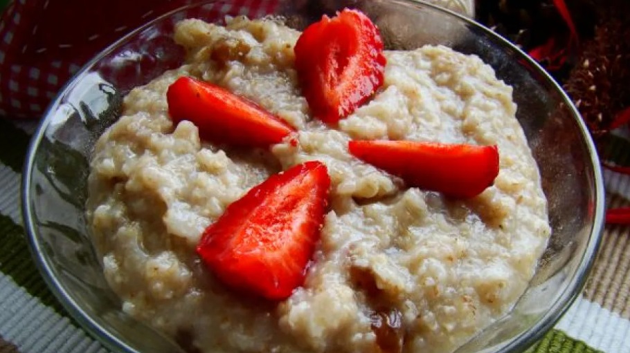 Boil a little less than a cup of water. Add the oatmeal and simmer. Add a tablespoon of ground flaxseed, raisins, goji berries, and honey. Mix everything and simmer for a while longer. Serve in bowls. Let it cool and garnish with pieces of strawberries.